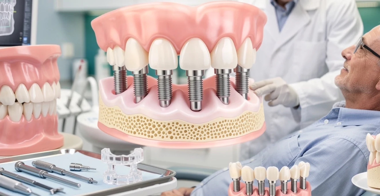 En cas d’édentement complet, plusieurs stratégies existent. Des prothèses complètes fixes (de type All-on-4 ou All-on-6) peuvent être vissées sur 4 à 6 implants, offrant une solution stable, confortable et esthétique, sans recours à une prothèse amovible traditionnelle. Une alternative consiste à utiliser des prothèses amovibles stabilisées par des attachements sur implants (boules, barres ou clips), qui améliorent nettement la tenue tout en restant retirables pour le nettoyage. Le choix de la restauration prothétique se fait en fonction de vos attentes, de votre budget, mais aussi du volume osseux disponible et de votre état de santé général.